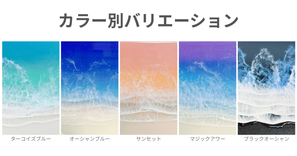 海レジンアートは、色の重なりや波の表情がすべて一点もの。同じデザインは二つとありません。